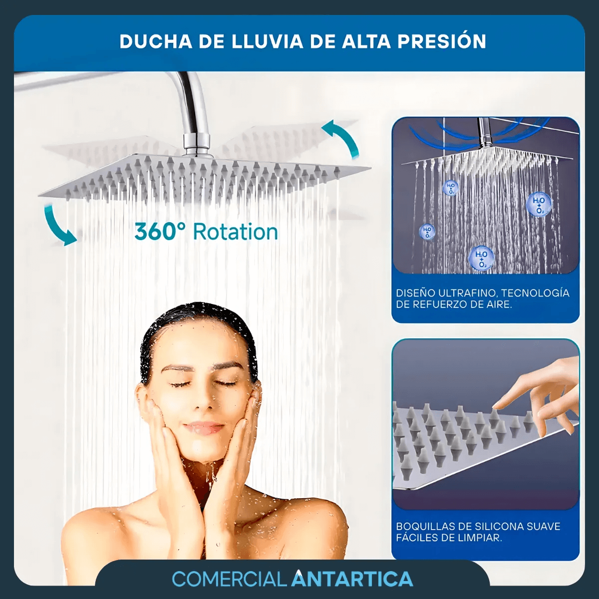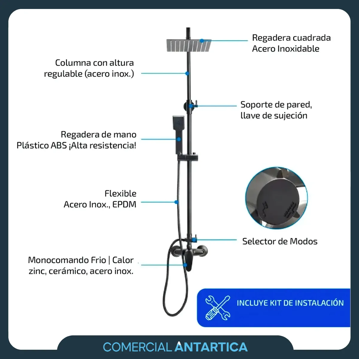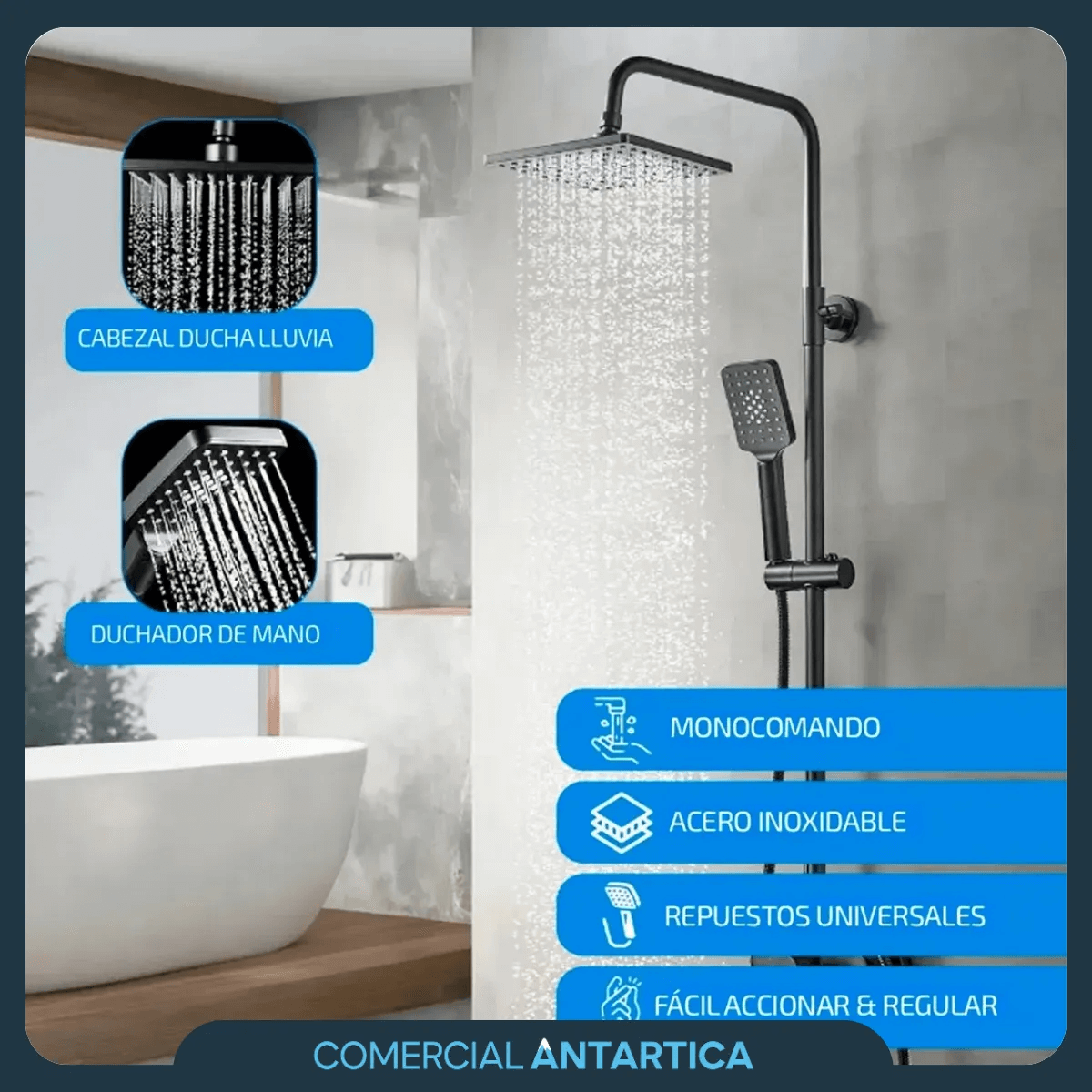 Incluye ducha superior cuadrada, duchador manual y canilla inferior.