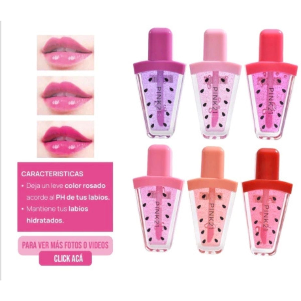 - Set de Tonos: El set incluye varios brillos de labios en una paleta de diferentes colores (tonos claros y fuertes).
