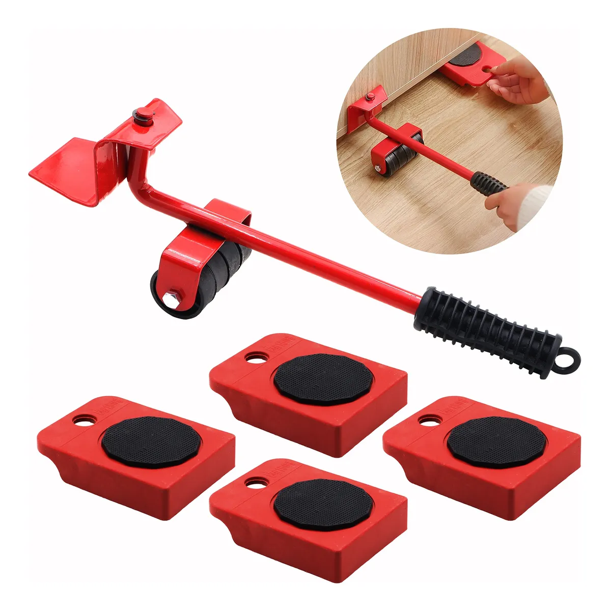 Sistema de ruedas para mover muebles de 5 piezas, diseñado para facilitar el desplazamiento de objetos pesados sin esfuerzo. Fabricado con materiales resistentes y duraderos, permite mover sofás, armarios y electrodomésticos de forma segura y estable, protegiendo el suelo y evitando lesiones